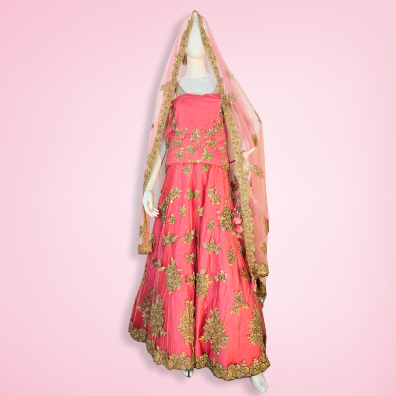"Elevate your bridal look with our exquisite Bridal Lehenga, SKU# 221139, designed to make your special day truly unforgettable. This stunning ensemble includes a beautifully crafted top (Tpos), a rich velvet lehenga, and a matching dupatta, all in a regal deep red shade that symbolizes love and tradition. Made from premium velvet fabric, the outfit offers a luxurious feel and elegant drape. ""Dry wash only"" is recommended to maintain its pristine condition. Disclaimer: Actual product color may vary slightly from the image. Cancellation: Available (Yes)."