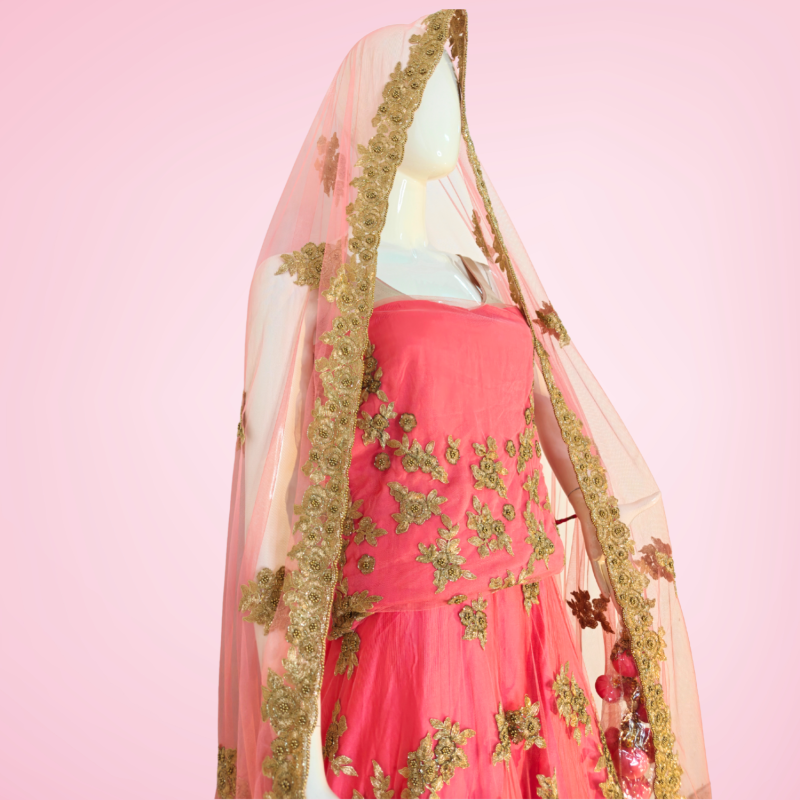 A hand ambroidered bridal leghanga with a moran style and tradional touch