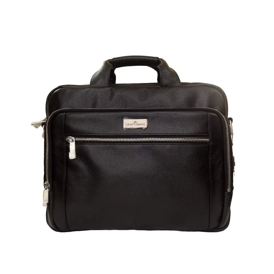 The Gents Executive Bag CFS-BG0-050 is a refined black bag featuring a prominent front zippered pocket and a top zip closure for the main compartment. It is equipped with sturdy top handles and a visible metallic "CRAFTSMAN" logo plate, offering a blend of functionality and professional style.