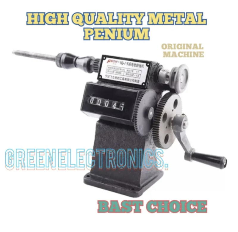 MANUAL HAND WINDING MACHINE. Count range: 0-99999. Origin: China. Importer: GREEN ELECTRONICS. Machine Penium: Total- METAL. Counting Penium: 1- Fiber Plastic. Force Load Weight: 20kg. Wrap wire diameter: 0.02-2.6mm. Maximum width: 100 mm. Max Diameter: 150 mm. Material: Cast iron frame, metal gear.
