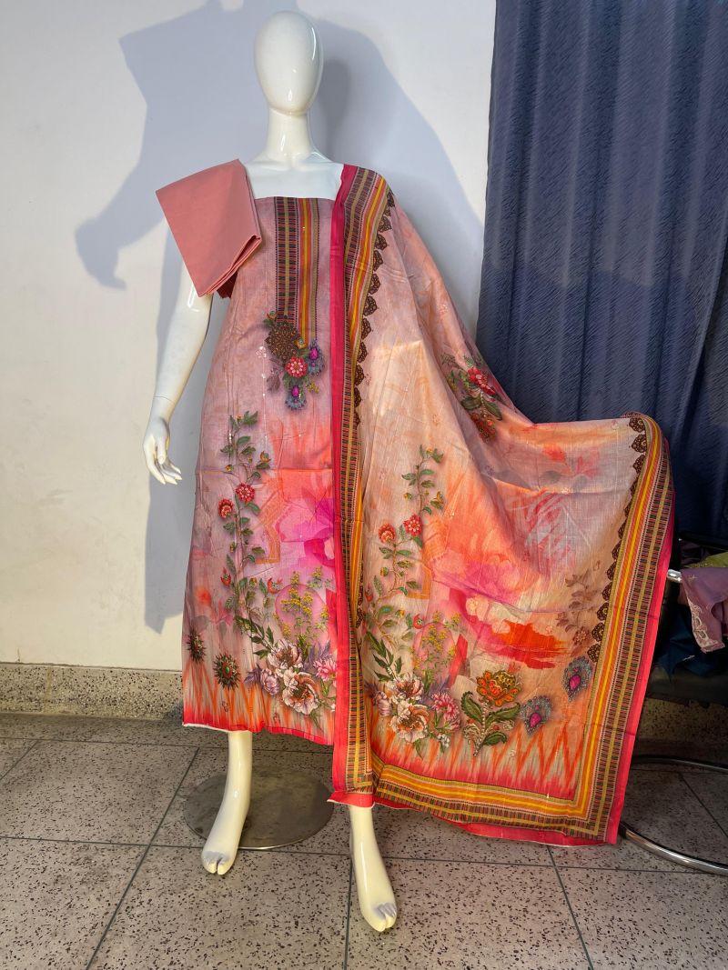 Pure cotton digital print, unstitched, three pieces with embroidery sequence work