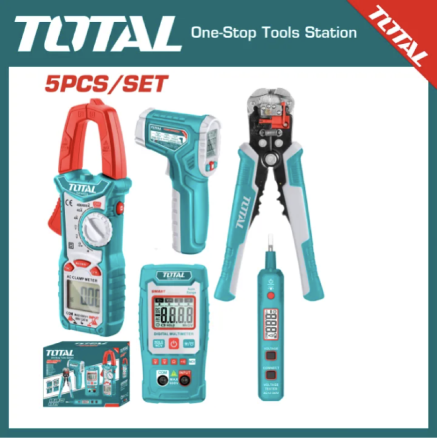 Product details of TOTAL Electrical Test Combo Kit (5pcs set) TOS23026 5pcs/set Include: 1 Pcs Digital AC clamp meter: AC Current: 4A/40A/400A/600A AC Voltage: 4V/40V/400V/600V DC Voltage: 400mV/4V/40V/400V/600V Resistance: 400Ω/4kΩ/40kΩ/400kΩ/4MΩ/40MΩ Capacitance: 4nf/40nf/400nf/4μF/40μF/400μF/4mf 1 Pcs Digital multimeter: Display: true RMS 2000 counts Smart function AC/DC Voltage: 0.8~600V Resistance: 600kΩ 1 Pcs test pencil: Test voltage: AC 12-300V LCD digital display Sound and light alarm 1 Pcs infrared thermometer: Temperature: -50°C~450°C (-58°F~842°F)