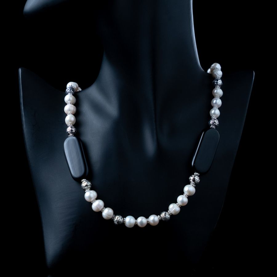 White Pearl Necklace with Black Gemstone