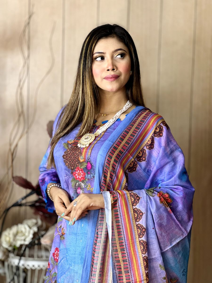 Pure cotton digital print, unstitched, three pieces with embroidery sequence work